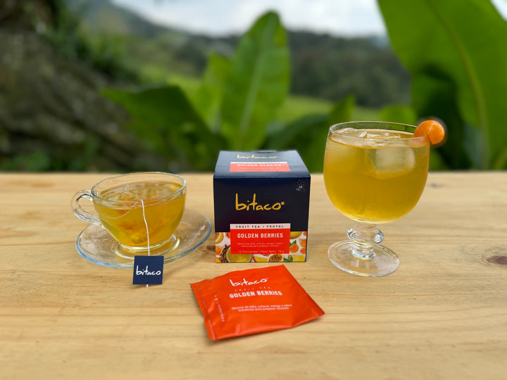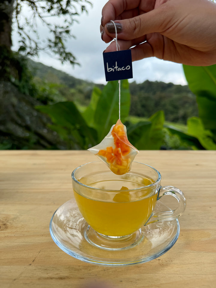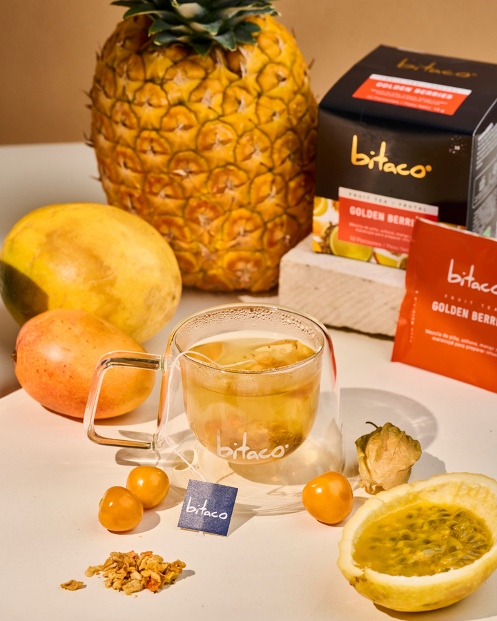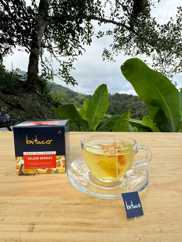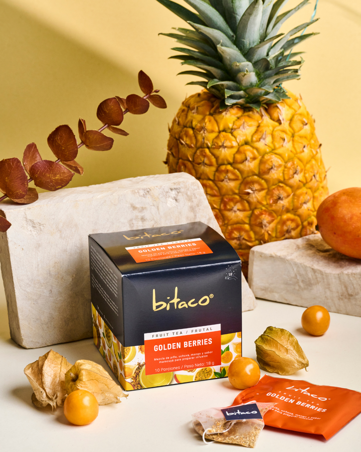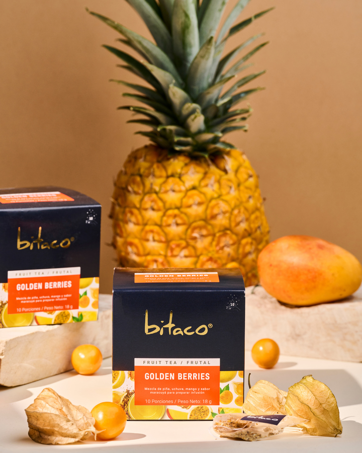 Es una exquisita mezcla de piña, uchuva, mango, maracuyá, papaya, regaliz y cúrcuma, para disfrutar del poder las frutas, sus vitaminas y antioxidantes que elevan tu estado de felicidad y armonía, donde lo dulce, lo ácido y lo tropical se mezclan