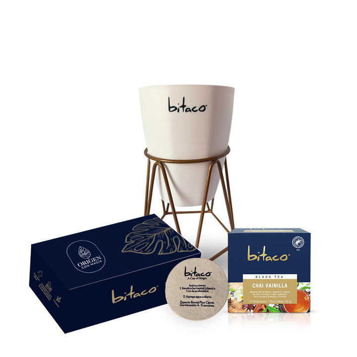 Este kit contiene: una caja con semilla de bonsái, una matera y té negro Chai Vainilla. Sin duda, el obsequio ideal para sorprender a alguien especial.