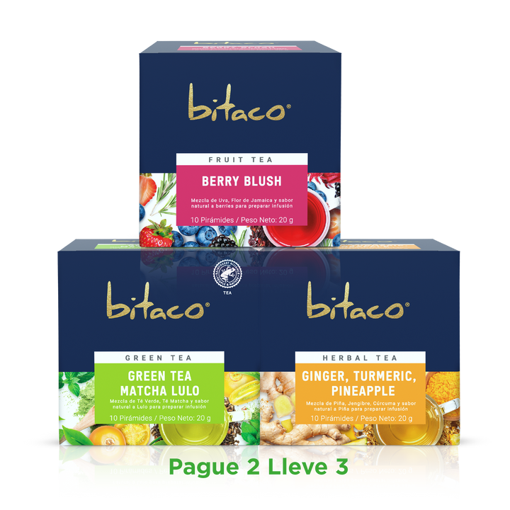 Disfruta de un día de calma con este pack de Bitaco que te ofrece tres deliciosas opciones: té verde matcha con lulo, infusión de jengibre, cúrcuma y piña, y la frutal berriblush. Aprovecha esta oferta y lleva 3 pagando solo 2 para vivir momentos únicos