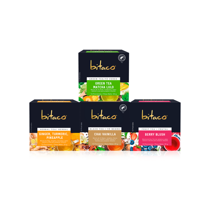 Disfruta este exclusivo pack que reúne lo mejor de cada línea de Bitaco: té negro chai vainilla, té verde matcha lulo, aromática jengibre cúrcuma piña e infusión frutal berry blush. Saborea cada variedad y aprovecha un precio inigualable.