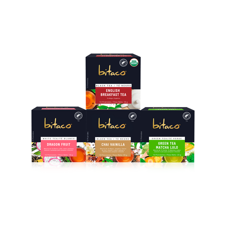 Aprovecha este excepcional pack de tés Bitaco, una fuente saludable de energía. Incluye té blanco con dragonfruit, té negro English Breakfast, té verde Matcha con lulo y té negro chai con vainilla para que disfrutes de una experiencia revitalizante.