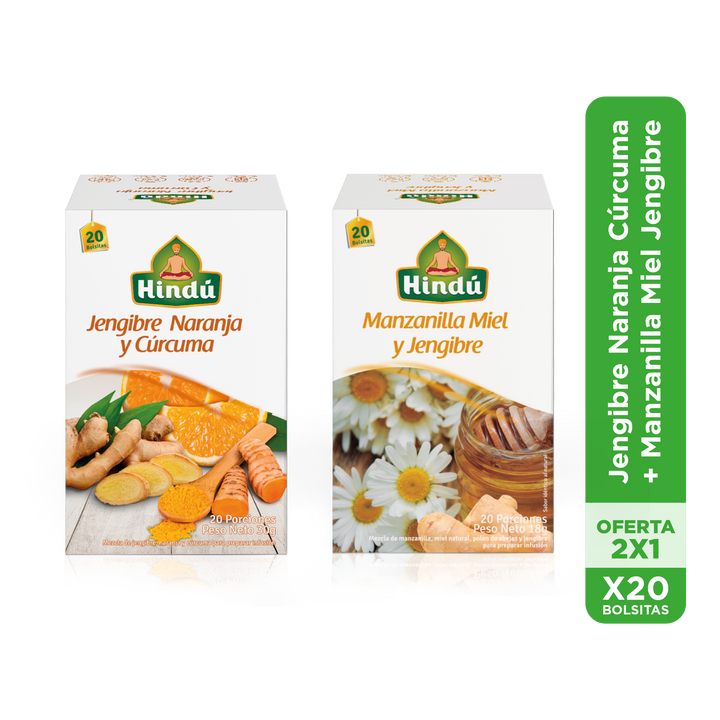 Pack 2x1 Jengibre Naranja Cúrcuma + Manzanilla, Miel y Jengibre x20