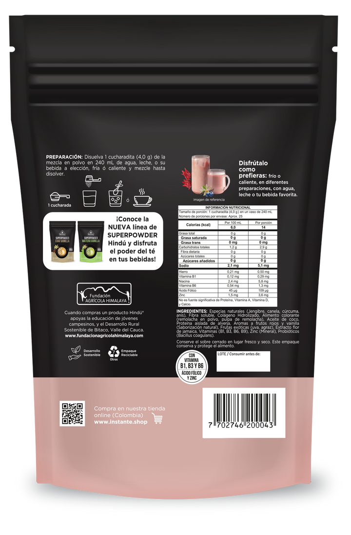 Un boost de energía y frescura en cada sorbo. El Superpowder Pink Boost combina lo mejor de las frutas y el bienestar en un té soluble, práctico y delicioso, ideal para quienes buscan vitalidad y equilibrio en su día a día. Práctico y fácil de preparar: mezcla instantánea.Sabor frutal, refrescante y lleno de vida.Perfecto para preparar en agua o leche, frío o caliente. Libre de cafeína, ideal para cualquier momento del día. 💖 Dale a tu rutina un toque de color, sabor y energía positiva con Pink Boost de Té Hindú.